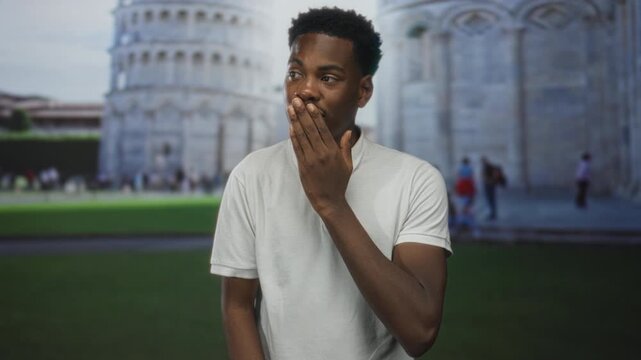 Young african american man covers mouth with hand at leaning tower of pisa building outdoors; surprise.