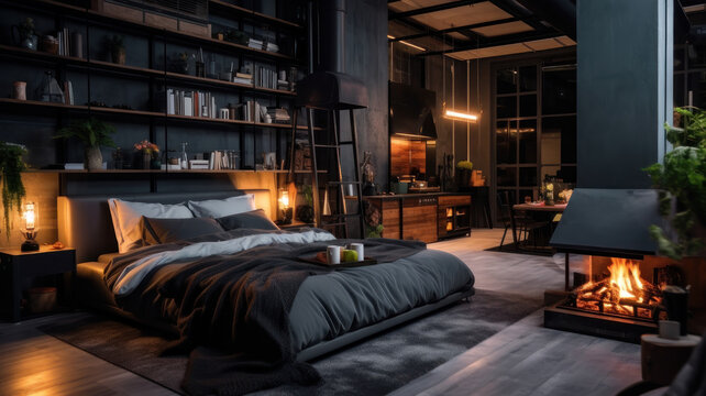 luxury studio apartment with a free layout in a loft style in dark colors. Stylish modern kitchen area with an island, cozy bedroom area with fireplace and personal gym