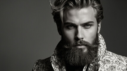 Profile illustration of a trendy hipster man with a modern fade haircut, a full beard, and a styled mustache, in black and white.
