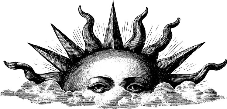 Vintage sun with stylised rays in retro engraving style for artistic design