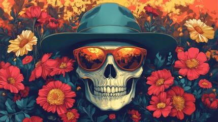Stylish Skull Wearing Sunglasses and Hat Surrounded by Vibrant Flowers – A Unique Blend of Edgy and Floral Aesthetics