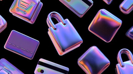 Futuristic 3D holographic shopping icons with bags cards and packages in vibrant iridescent tones on black background symbolizing digital commerce