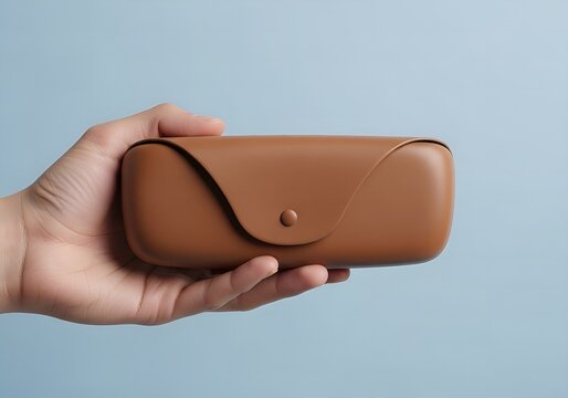 Hand holding a stylish brown leather glasses case with a secure snap closure against a soft blue background