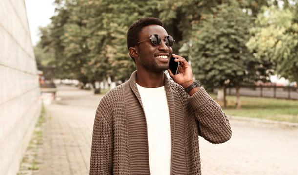 Trendy dressed hipster girl in hat enjoying outdoors walking on city street talking on mobile phone, beautiful 20s woman in stylish apparel satisfied with international roaming connection making call
