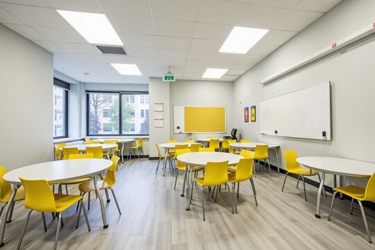 A modern classroom with sleek furniture and bright yellow accents. The walls are painted in soft gray, and there are colorful posters and a large whiteboard
