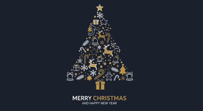 Festive Christmas tree design composed of various holiday-themed icons, with greetings.