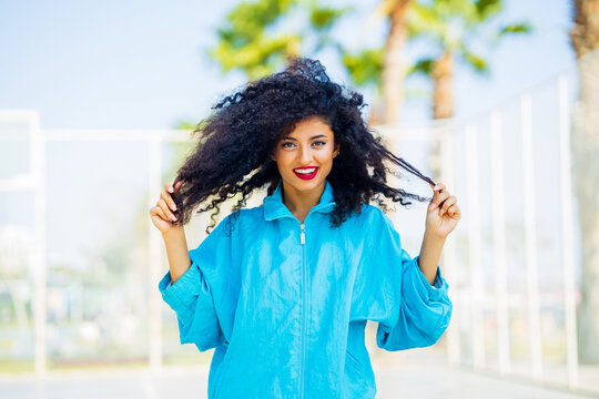 multicultural race woman with curl hair in blue windbreaker outdoor