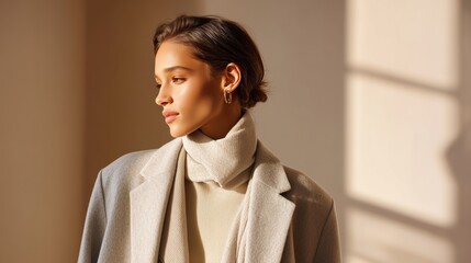 Thoughtful stylish mature woman walking on beach by sea. Alone senior woman in brown coat on seashore outdoors