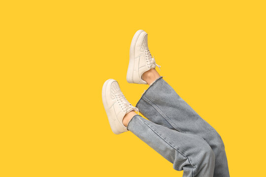 Man in white sneakers shoes on asphalt at sunset. Men's shoes
