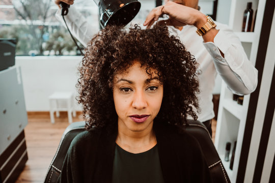 Beautiful latin woman with short curly brown hair getting a treat at the hairdresser. Latin hairdresser working her afro hair. Lifestyle