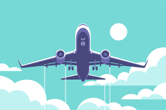 Airplane gaining altitude between clouds. Travel and vacation time. Vector illustration in a minimalistic style.