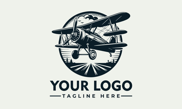 Vintage biplane logo design, showcasing a classic airplane against a stylized landscape.