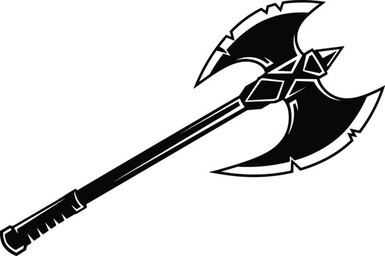 “Detailed fantasy double-bladed battle axe vector illustration, sharp ornamental weapon design for gaming, medieval art, digital concept graphics, black silhouette style, high-quality artwork”