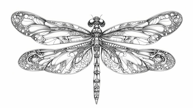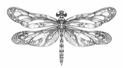 Stylized dragonfly vector illustration showcasing intricate wing patterns and vibrant colors on a plain backdrop..eps