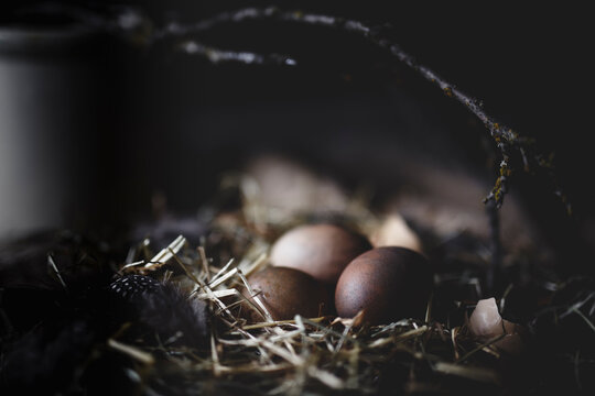 Stylized black and white illustration of a cracked egg with scattered shell fragments on a white background