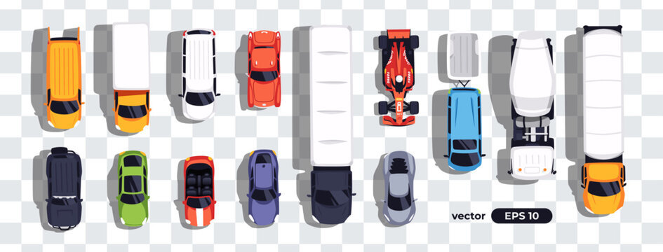 Top view cars set isolated. View from above. Cute cartoon transport. Modern urban vehicle. View from the bird's eye. Realistic car design. Flat style vector illustration. Truck. concrete mixer.