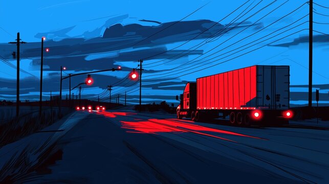 Flat vector illustration of an abstract futuristic white electric semi trailer truck with trailer in modern design with sleeper cabin charging at the charger station. Side view, cartoon style.