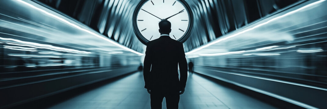 A solitary figure in a suit is silhouetted against a large clock in a busy train station, symbolizing time and modernity.