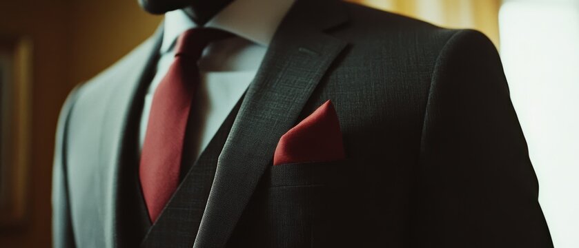 A man in a sharp suit with a red tie and pocket square stands poised, exuding elegance, confidence, and classic style.
