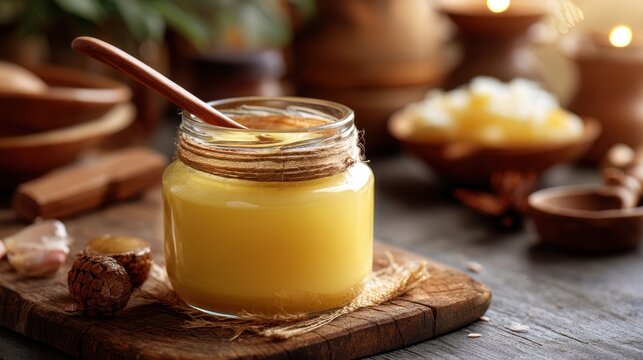 Ghee in glass jar with wooden spoon on tabletop. Traditional clarified butter for cooking and ayurvedic health benefits.