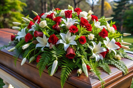 A Beautiful Casket Spray Of Red Roses, White Lilies, And Greenery.