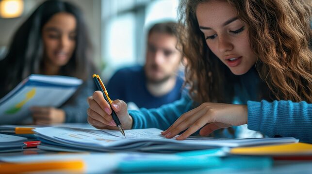 A focused student studies with classmates, writing notes and engaging with educational materials in a bright environment.