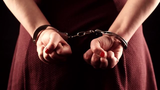 submissive woman wearing a purple dress in leather handcuffs on black background