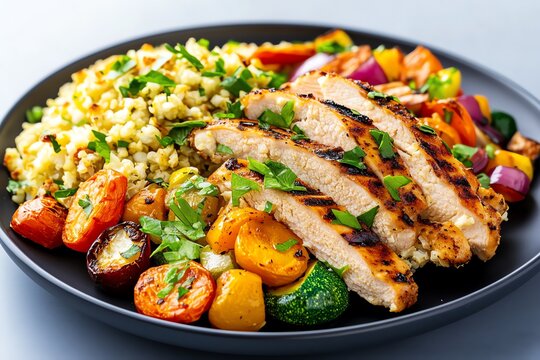 A plate of cauliflower rice with roasted vegetables and grilled chicken, showing a typical low-carb meal substitution