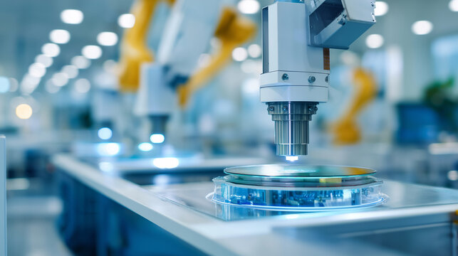 Inside an ultra-clean semiconductor fabrication facility, automated wafer handling systems with robotic arms move silicon wafers between glass substrate processing equipment.