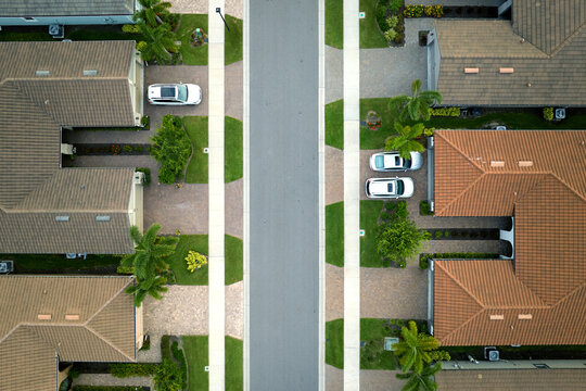Aerial view of tightly located family houses in Florida closed suburban area. Real estate development in american suburbs