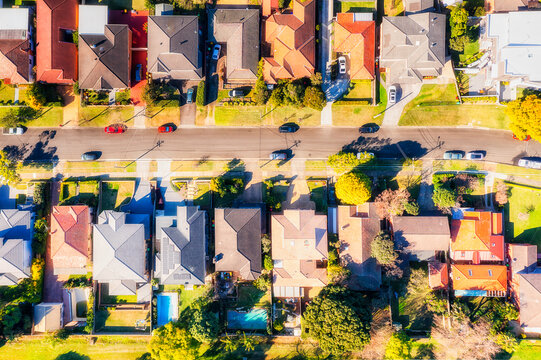 Aerial Drone view looking down on Commercial Suburb of Burwood in Sydney residential houses in suburbia suburban house roof tops and streets park NSW Australia