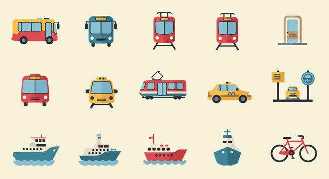 A modern flat design vector illustration depicting a comprehensive set of public transportation icons, perfect for web, mobile apps, or infographic use.