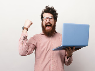 young business people meeting office teamwork victory win success corporate discussion laptop celebrating