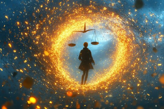 Magic Portal Glow. Silhouette businessman carrying briefcase walking through magical glowing portal with sparkles and scales of justice symbol, futuristic fantasy background, business concept, succes