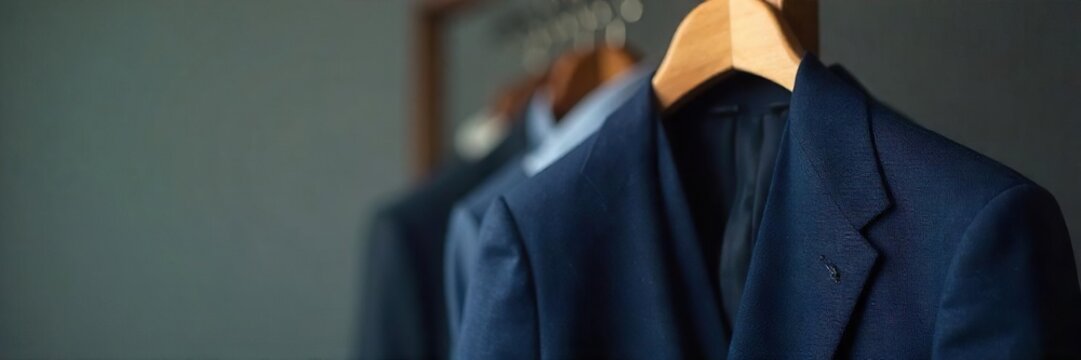 Sharp, tailored business suit hanging on a luxury wooden hanger, ready for a successful day Perfect for corporate, success, and achievement imagery , confidence, businesswoman, leadership