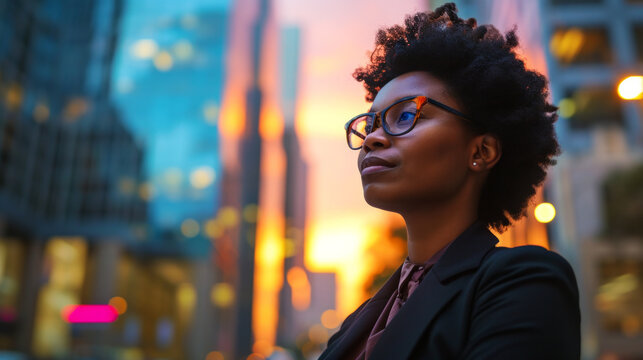 Happy wealthy rich successful black businesswoman standing in big city modern skyscrapers street on sunset thinking of successful vision, dreaming of new investment opportunities