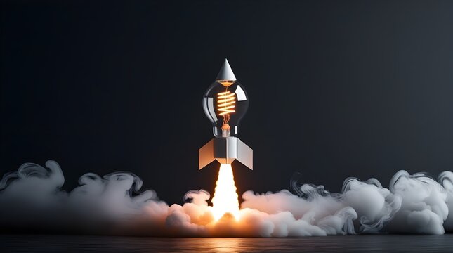 a light bulb rocket taking off, creative idea or development successful launches, large space for copy