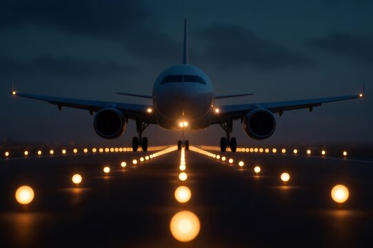 Passenger airplane on a brightly lit runway at night, moving towards successful travel, journey, business, and adventure
