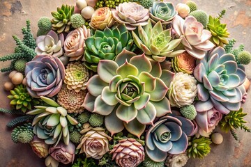 A group of miniature succulent flowers of succulents. Close-up of the multicolored tops of the echeveria plant. Flowering indoor plants.
