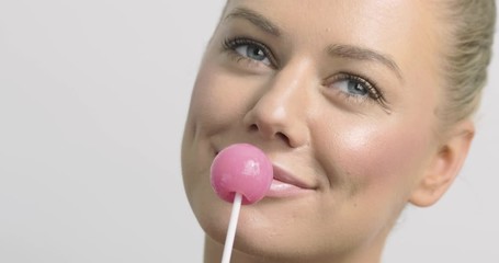 Close-up of a flirty and playful woman with a pink lollipop.