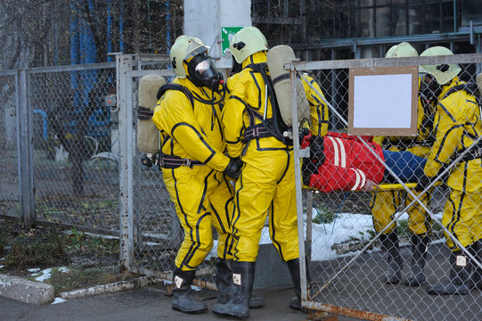 Rescuers in protective rubber suits and masks carrying the sufferer on stratcher from contaminated plant territory. Rescue team training