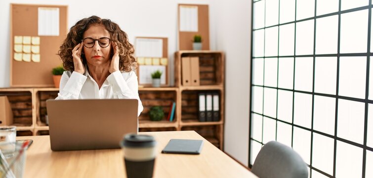 Unhappy businessman suffering from neck pain in the office, laptop on the desk, blurred background. Distressed man with his head between his hands and face down at the work table.