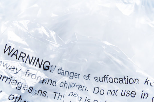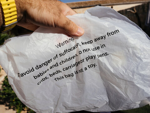 A close-up of a male hand holding a plastic bag with warning text to avoid the dangers of suffocation and notes that the bag is not a toy, emphasizing safety precautions