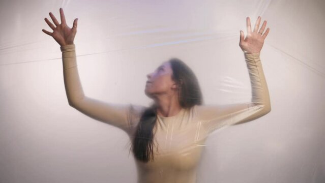 A young woman is trying to break through the plastic. The concept of pollution of the planet with plastic.