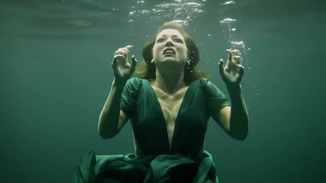 Woman in green dress submerged underwater with bubbles and outstretched hands showing distress