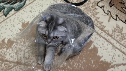 Top down shot of domestic Scottish Fold cat lying inside clear plastic bag on patterned carpet. It moves its head and looks around briefly, with striped gray fur and folded ears.