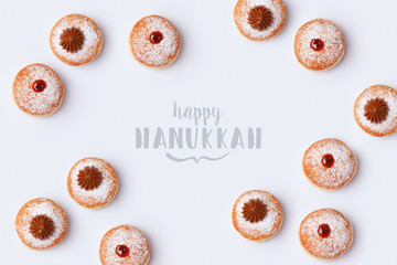 High angle view of Hanukkah Sufganiyot sweet desserts on table