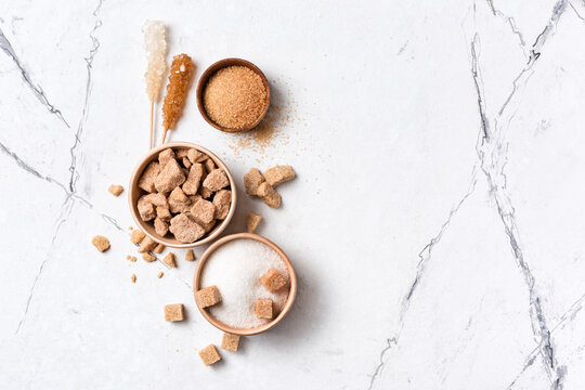 Bowls of brown cane lump and granulated white sugar with crystal sugar stick