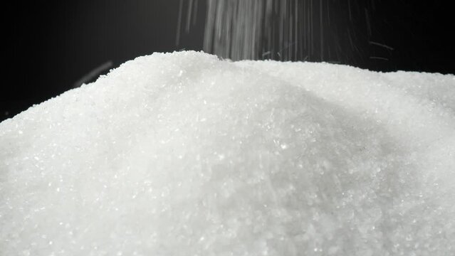 A macro video captures white sugar delicately cascading onto a sleek black background, enchanting viewers with its graceful descent. The probe lens offers a perspective, revealing intricate details