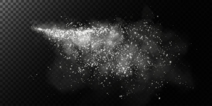 Dust sparkles and stars glow. Placer icing, sugar effect png, baking salt and flour, white powder.Vector glitter on transparent dark background. Christmas light effect. Sparkling magic dust particles.